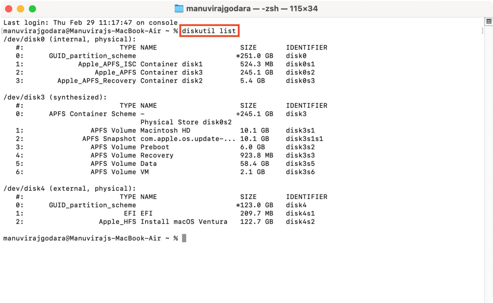 diskutil listy presiona Introduce. Este comando lista todas las unidades conectadas a tu Mac. Busca tu unidad USB en la lista.