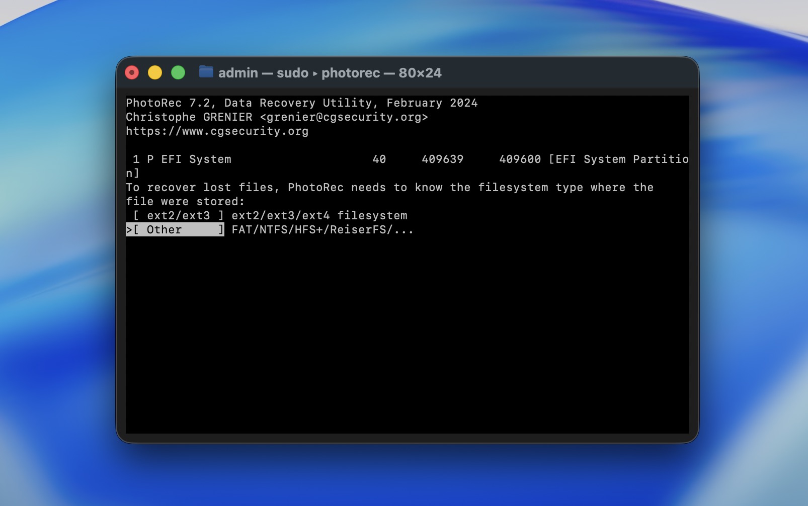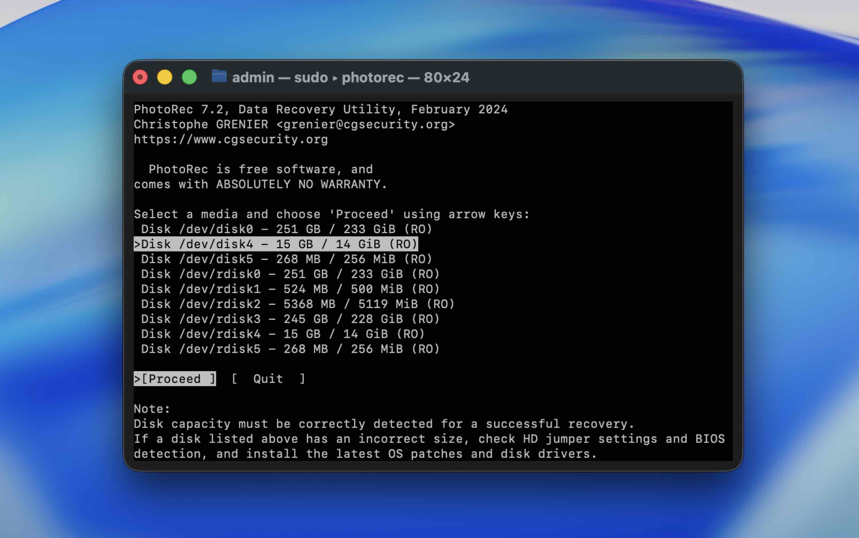 - För att installera verktyget, öppna Terminal (gå till Launchpad > Terminal) och kopiera-och-klistra in följande kommando: sudo photorec.